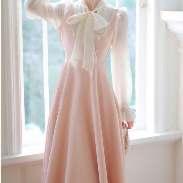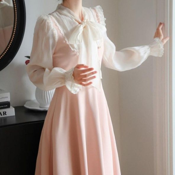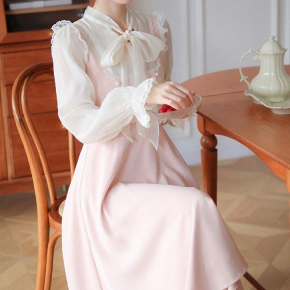襟元の上品なリボン結びと裾広がりのフレアシルエットが女性らしさを引き立てます。