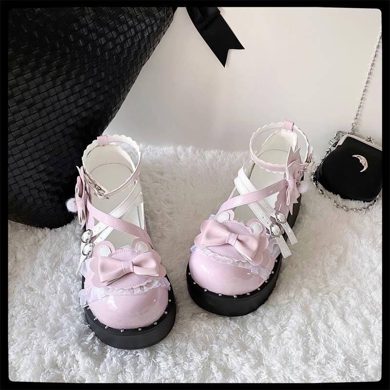 足首を優しく包み込むフリル付きストラップと、大きなリボンモチーフが儚げな雰囲気を演出します。