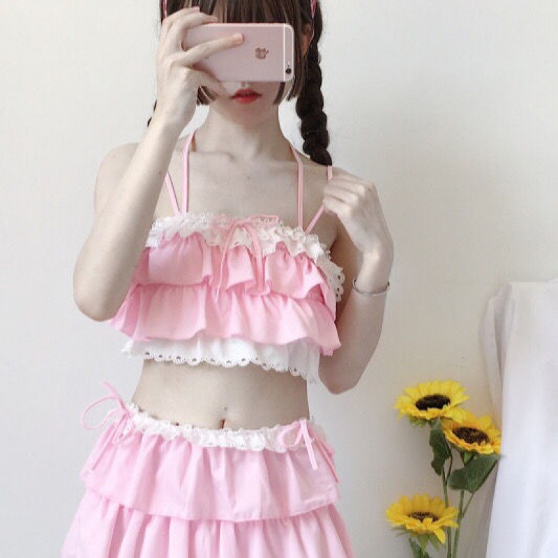 地雷系ファッションの定番、ゴシックロリータテイストを取り入れた水着セットです。