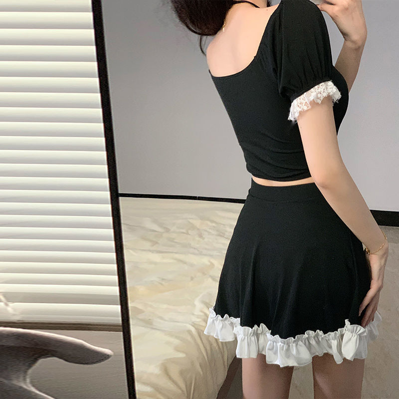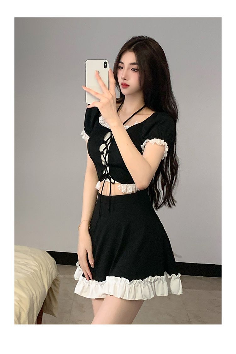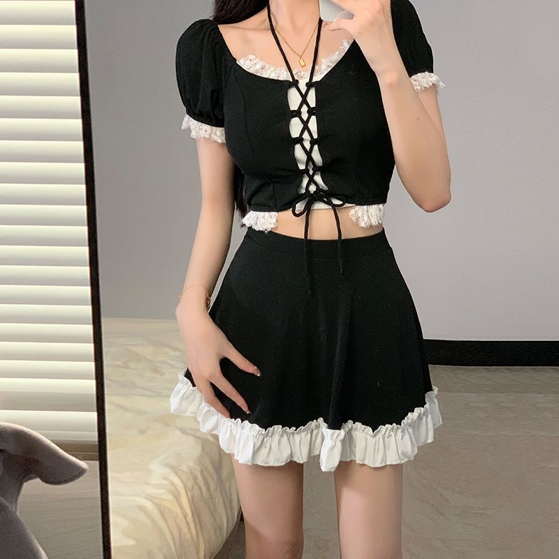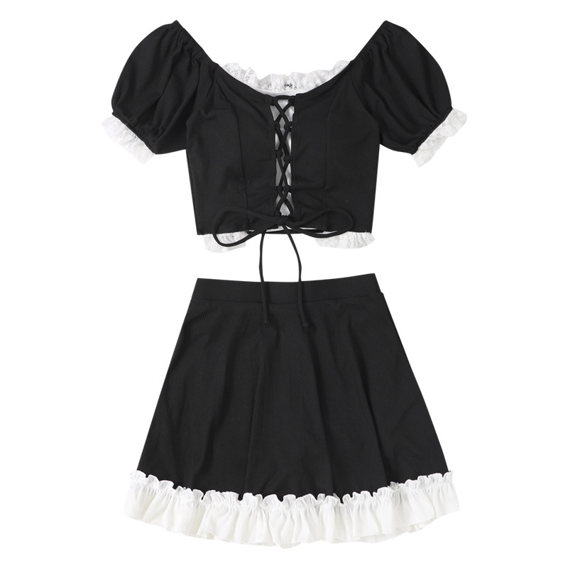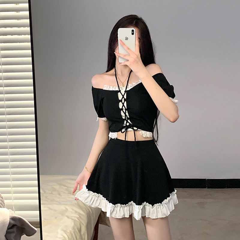 オフショルダーのトップスには胸元に編み上げリボンデザインを施し、甘さと個性を両立させました。
