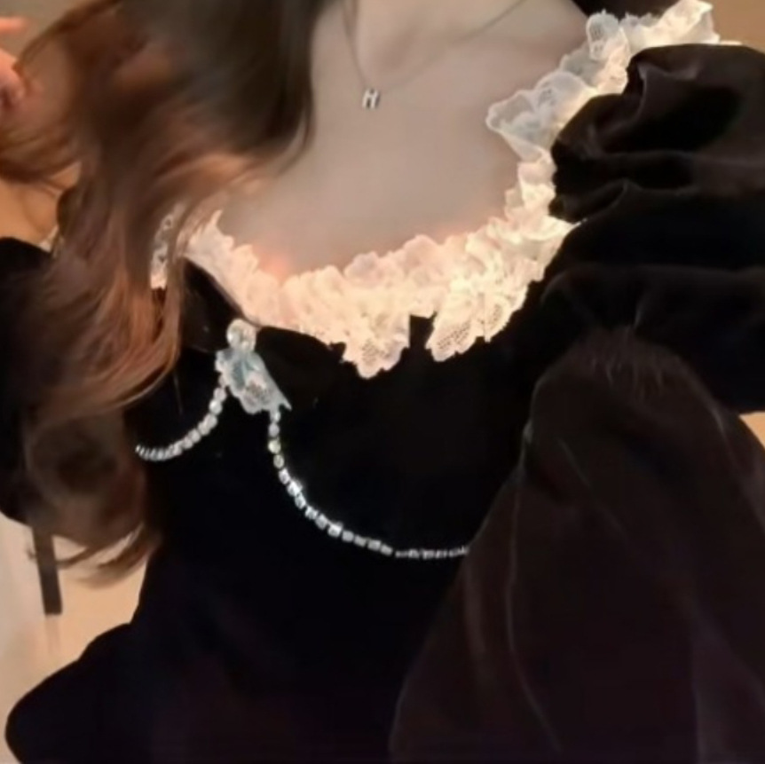胸元のレース装飾とパール風チェーンが上品さをプラスし、特別な日の着用にもぴったりです。