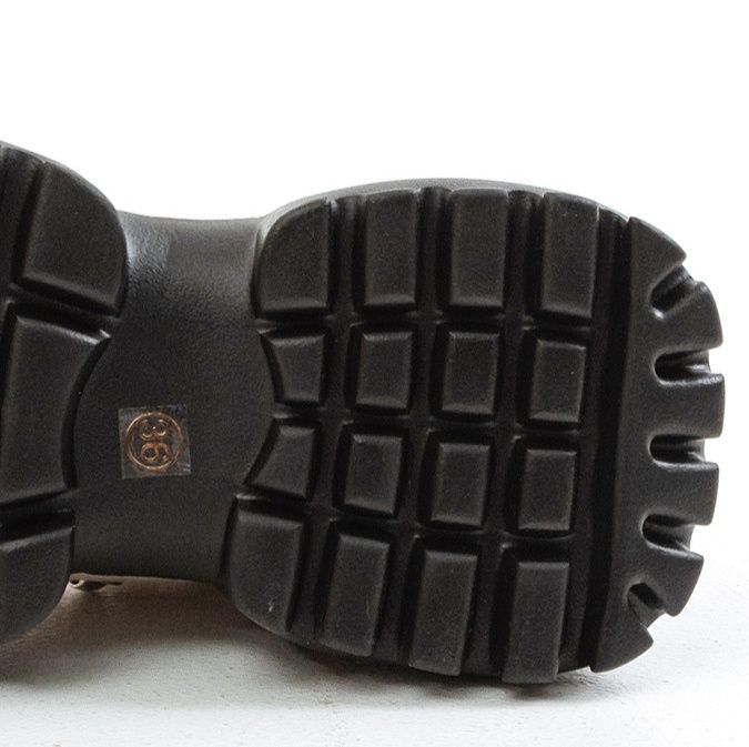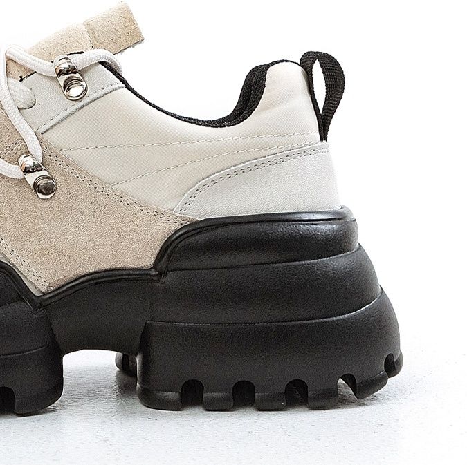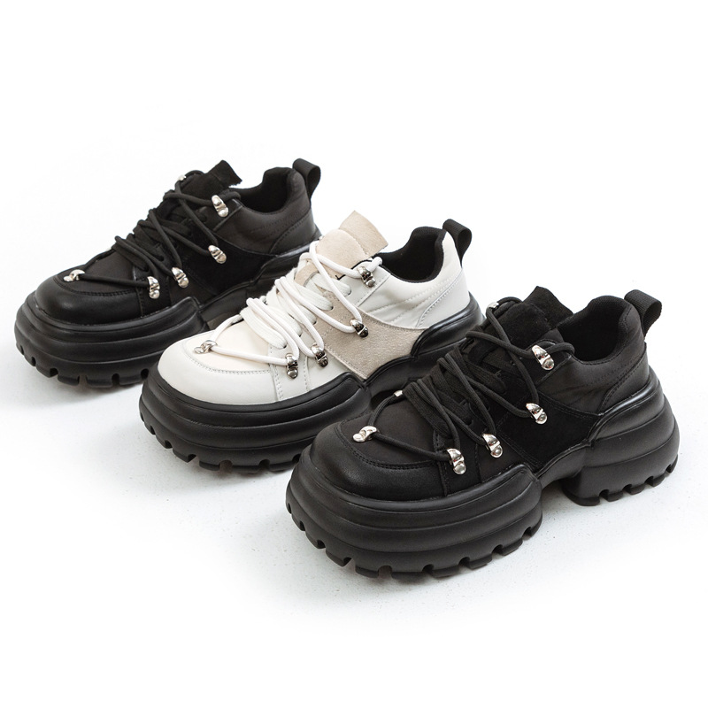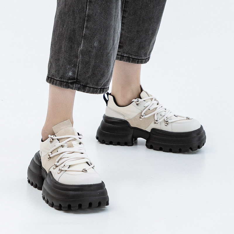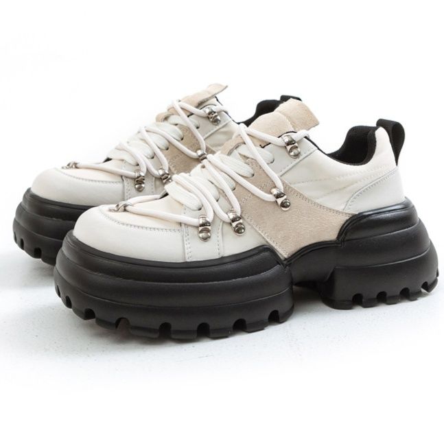 ボリューム満点のソールとトレッキングブーツ風の紐デザインが特徴的で、足元から個性を主張できます。